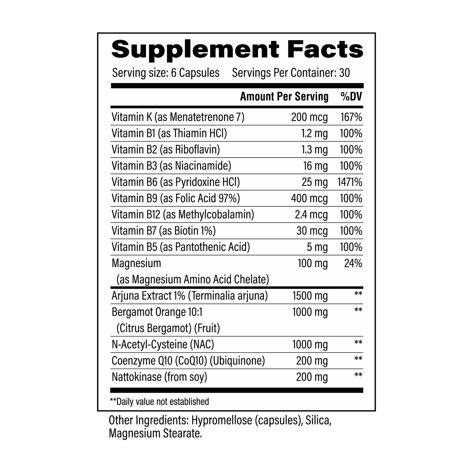 Vitamin K (as Menatetrenone 7), Vitamin B1 (as Thiamin HCI), Vitamin B2 (as Riboflavin), Vitamin B3 (as Niacinamide), Vitamin B6 (as Pyridoxine HCI), Vitamin B9 (as Folic Acid 97%), Vitamin B12 (as Methylcobalamin), Vitamin B7 (as Biotin 1%), Vitamin B5 (as Pantothenic Acid), Magnesium (as Magnesium Amino Acid Chelate), Arjuna Extract 1% (Terminelia Arjuna), Bergamot Orange 10:1, N-Acetyl-Cysteine (NAC), Coenzyme Q10 (CoQ10) (Ubiquinone), Nattokinase (from soy)